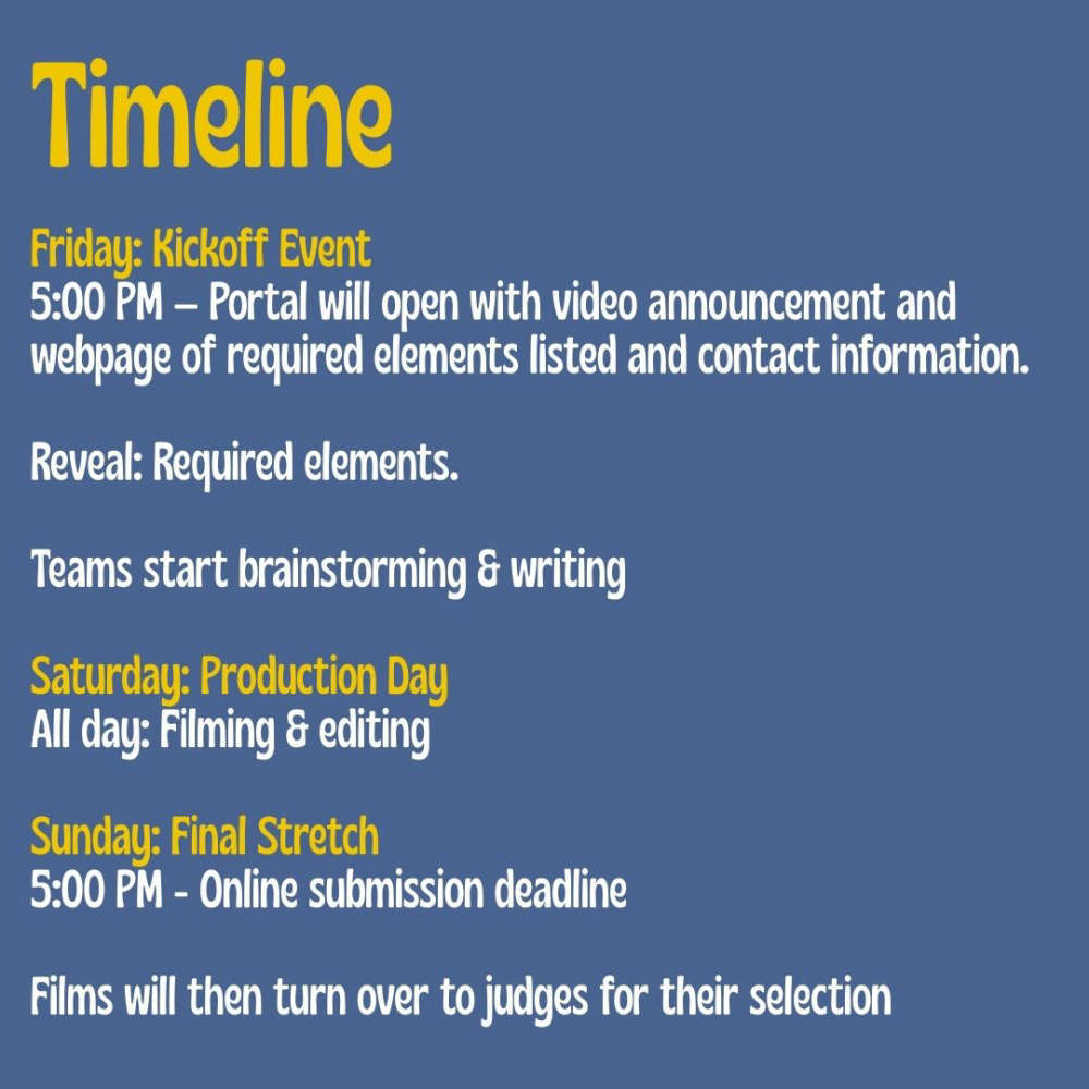 Goal: Teams have 48 hours to conceptualize, shoot, edit, and submit a short film based on a theme and required elements revealed at kickoff.